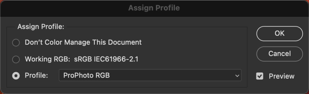 4. Now in the Menu go to EDIT then down to Assign Profile. You should see Assign Profile, Set the Profile to ProPhoto RGB