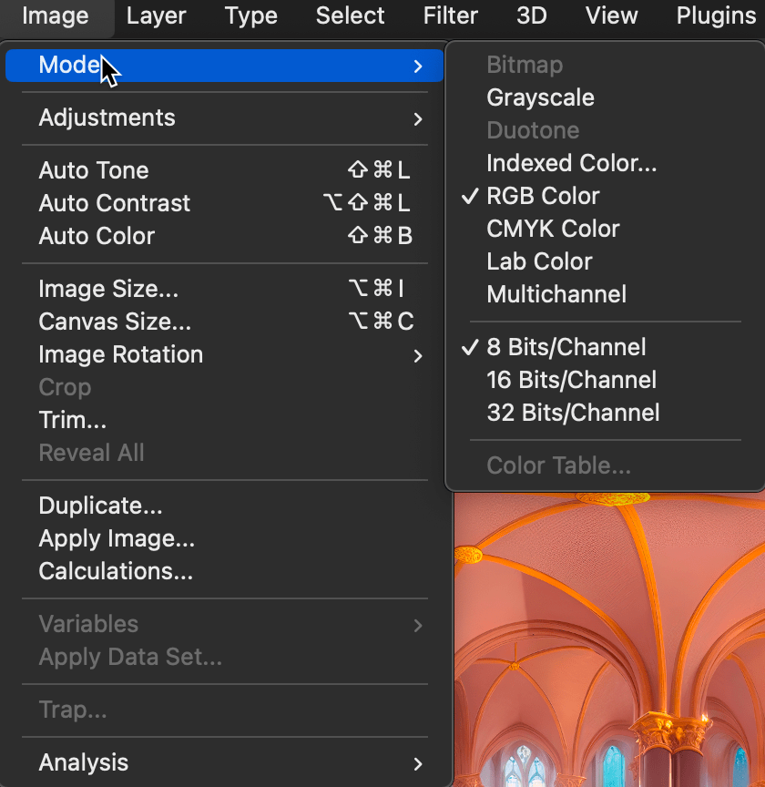 5. Now Go back to the Menu and Pick Image then Mode and change the Bit depth from 8 Bits to 32 Bits.