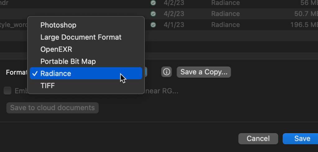 6. This is the last step in Photoshop, Go to File and do a Save As, and select Radiance from the Format List, Name your file and hit save. You should now have an HDR file. You can also use openEXR but I think Radiance is preferred.