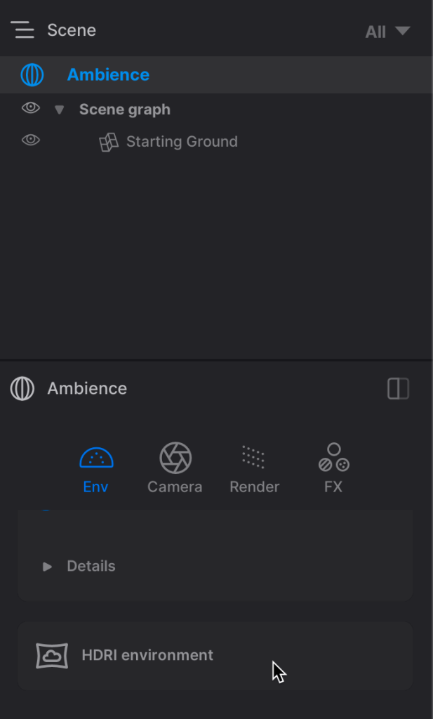 4. Next select Ambience in the Scene Graph, This is the Environment.