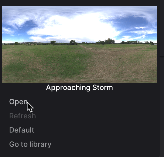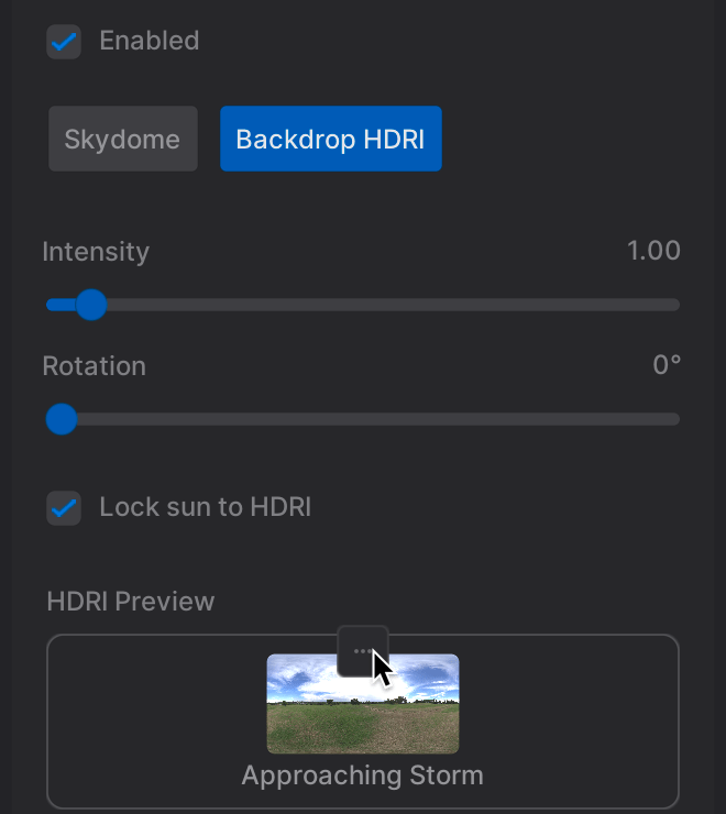 7. Check off Enabled, select Backdrop HDRI, Scroll down and select the Ellipsis on the Approaching Storm image (or whatever image is there)