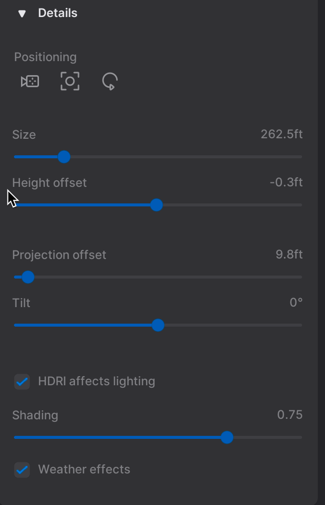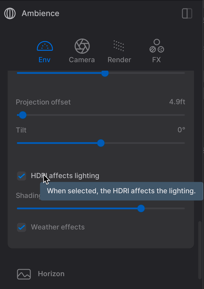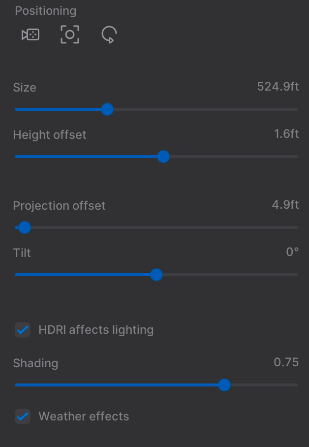 Projection Offset: 4.9’ Determines the vertical UV projection of the HDRI on the hemisphere dome of the Backdrop.