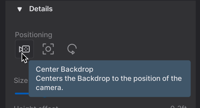 Height Offset: 1.6’ Determines the height offset of the Backdrop relative to its default position. I think this should be close to zero and 1.6′ seems to work well