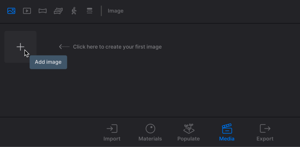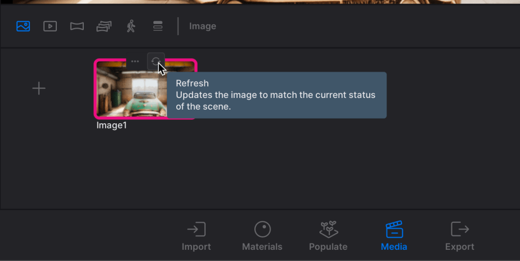 12. Go to the Media dock at the bottom of your screen, Select Media and then select the plus to Add and Image. This gives you a snap shot to come back to when your screen gets messed up and it most likely will at some point. I do this because you will eventually select your screen with your left mouse button, if you haven’t do so already, and this will mess up your HDRI image. To pan around in the scene use your RIGHT mouse button and DON’T scroll with your mouse wheel. Sometimes it can’t be avoided and you have to zoom up to something and I scroll in and just reset my view afterwards. You can also access the AWSD Keys in conjunction with the right mouse button.