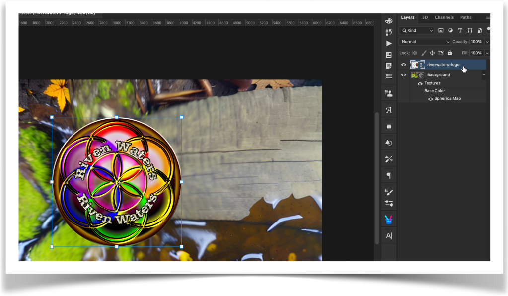 4. Your layers should now have a new 3D layer, and you will be able to maneuver around in the Pano now. Your logo will most likely be in the middle of your screen, and it still should be on its own layer. Navigate to the bottom of the Pano so your logo is in the correct position. Make any changes to the size at this time and any other changes because once we “Bake” it into the Pano, there will be no changing it after the fact.