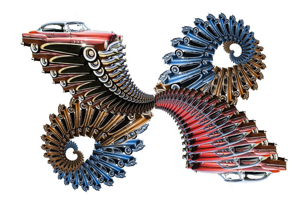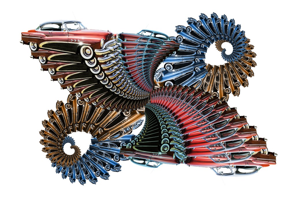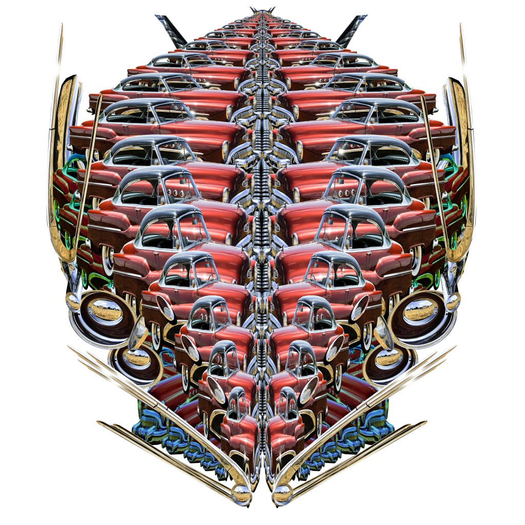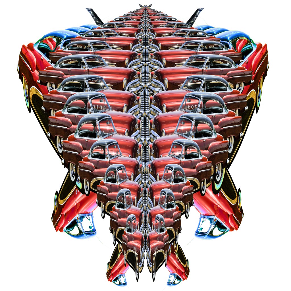 In this first installation of “One Object” art I chose this stock image from a car show, photographer unknown. I started by cutting out the car which I consider a group of objects. From this one object I created all the images you see below, no other images were used to create the images, just pieces and parts of the same object.